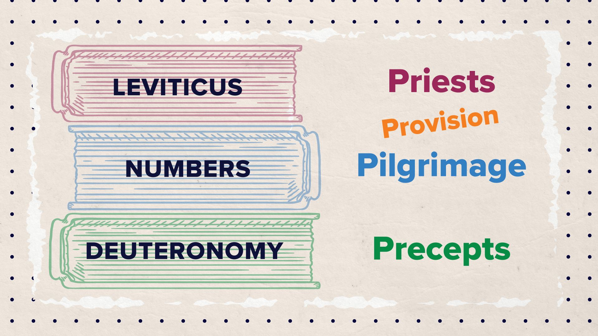 This week we covered three books of the Bible that tie into Israel’s 40 years of wandering in the desert. Together they give us four key words: Priests, Provision, Pilgrimage, Precept.