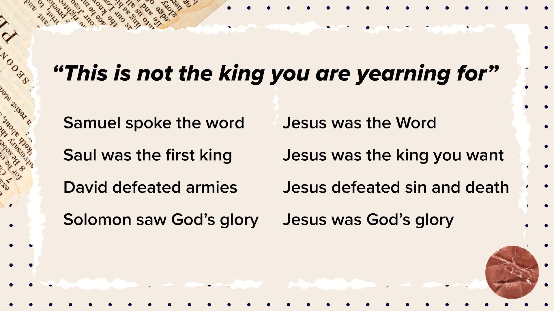 Every king of Israel—no matter how strong, wise, or faithful—eventually failed. The message of the United Kingdom is clear: This is not the king you are yearning for.